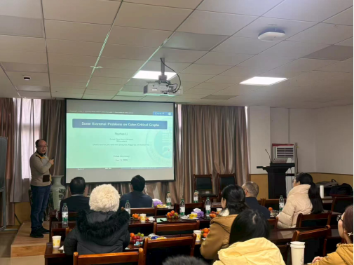 华中师范大学李书超教授的报告题目是《Some extremal problems on color-critical graphs, and beyond》。报告伊始,李书超教授以谱图兰型问题为切入点,系统梳理了该方向的研究背景与发展脉络,并介绍了处理谱图兰型问题的常用思路与方法。随后,李书超教授重点汇报了其团队在图兰型问题与谱极值图论方面的研究进展,着重展示了相关结论中的极值图构造与刻画,并对比了在“给定边数”和“给定点数”等不同约束条件下极值图的差异与特点;同时结合经典结果与已有工作进行对照,进一步凸显了所研究问题的重要性与创新性。报告最后,李书超教授与本团队教师就相关应用及后续可拓展的研究方向展开了深入交流,并对进一步推进的关键问题给出了富有建设性的建议与指导。整场报告内容充实、逻辑清晰、深入浅出,激发了师生的学术热情,也为后续研究提供了有益启示。